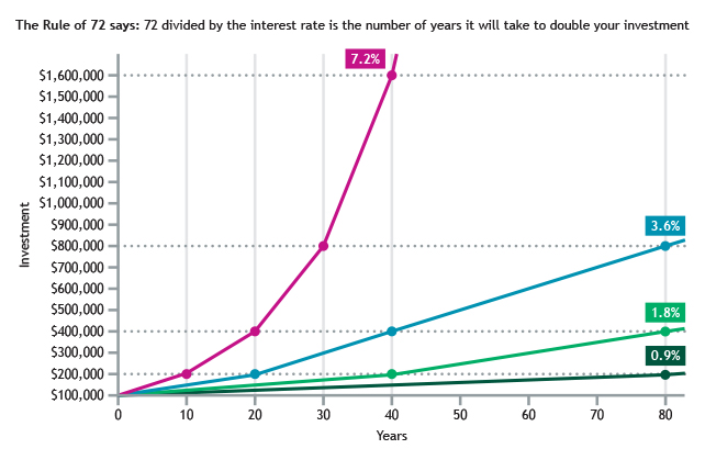 The rule of 72 is a simple approximation of how long it will take for an investment to double in value. The rule states that you can estimate the number of years it will take if you divide 72 by the annual interest rate. For example, if you have an investment with a fixed rate of 7.2% it will take approximately 10 years for the investment to double because 72 divided by 7.2 is 10, whereas, at 3.6% (half of 7.2%), it takes twice as long because 72 divided by 3.6 is 20, and so on.